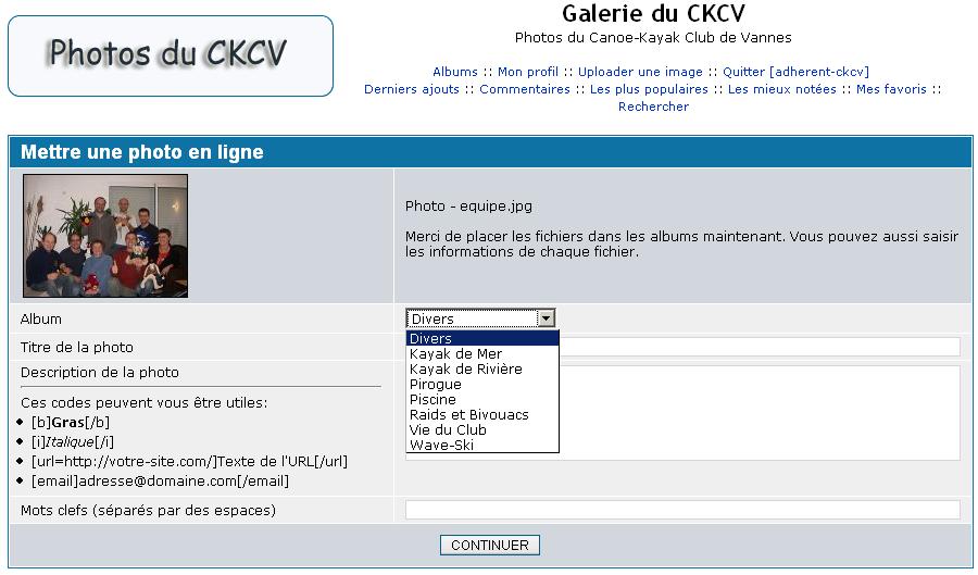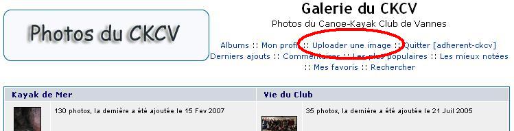 Il est possible d'ajouter des photos sur le site. La première solution est de passer par le menu "Photos", de s'identifier puis de télécharger les photos 5 par 5. Les photos seront ensuite validées par thème et visibles sur le site Web du CKCV (cette solution est détaillée ci-dessous). La seconde solution est d'envoyer un mail avec les photos en pièce-jointe au webmaster.