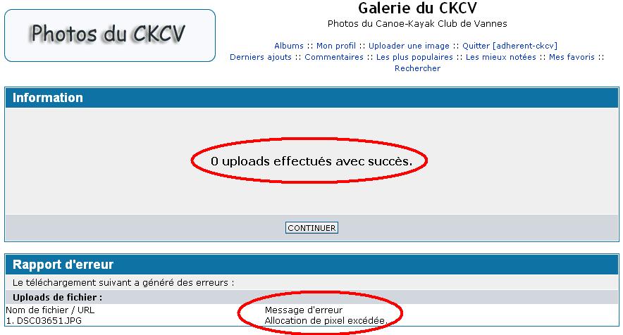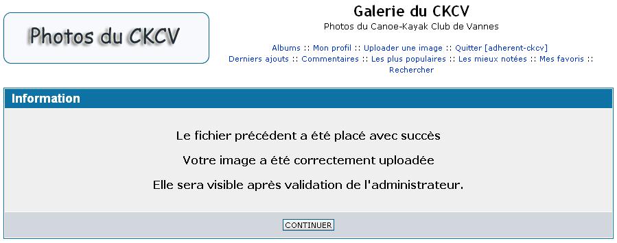 8 - Cliquer sur le bouton "Continuer". Le WebMaster du site recevra un email pour informer que des images ont été publiées sur le site et doivent être validées.