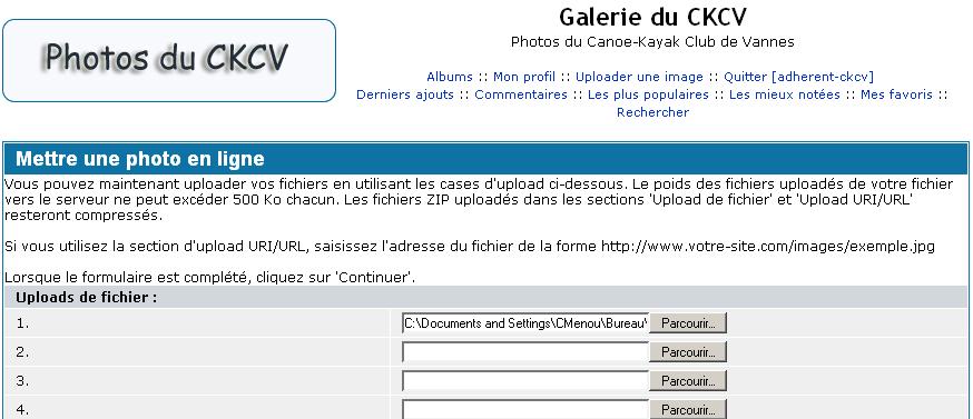 4 - Il est possible de charger jusqu'à 10 images depuis des photos présentes sur l'ordinateur ou 5 images depuis des sites sur internet. Il suffit de selectionner chaque fichier image en cliquant sur le bouton "Parcourir...". Attention, la taille étant limitée sur le site du ckcv, il sera souvent nécessaire de retravailler l'image pour réduire la dimension et la résolution. Le plus simple étant d'utiliser un logiciel de dessin (Paint par exemple ou Photoshop). Cette opération sera présentée prochainement sur le site (réduction de la taille d'une photo en utilisant Paint).