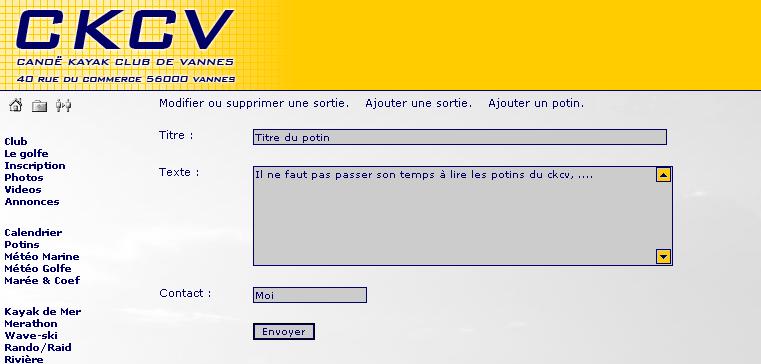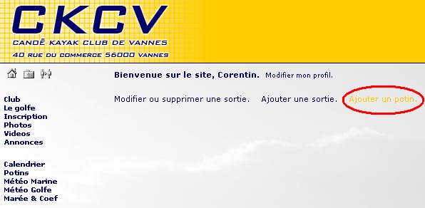 Il est possible d'ajouter un potin qui sera visible dans la liste des potins du ckcv en première page. Lors de l'ajout d'un potin, il faut aussi penser à diffuser l'information avec la liste de diffusion du ckcv. Il suffit donc d'envoyer un mail à ckcv@ml.free.fr.