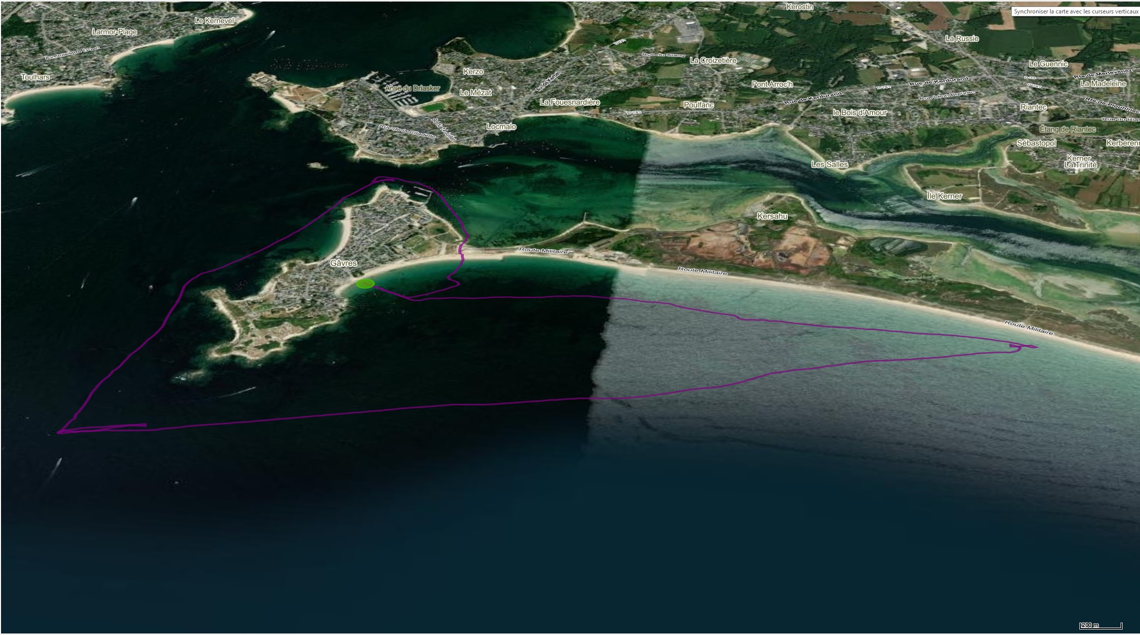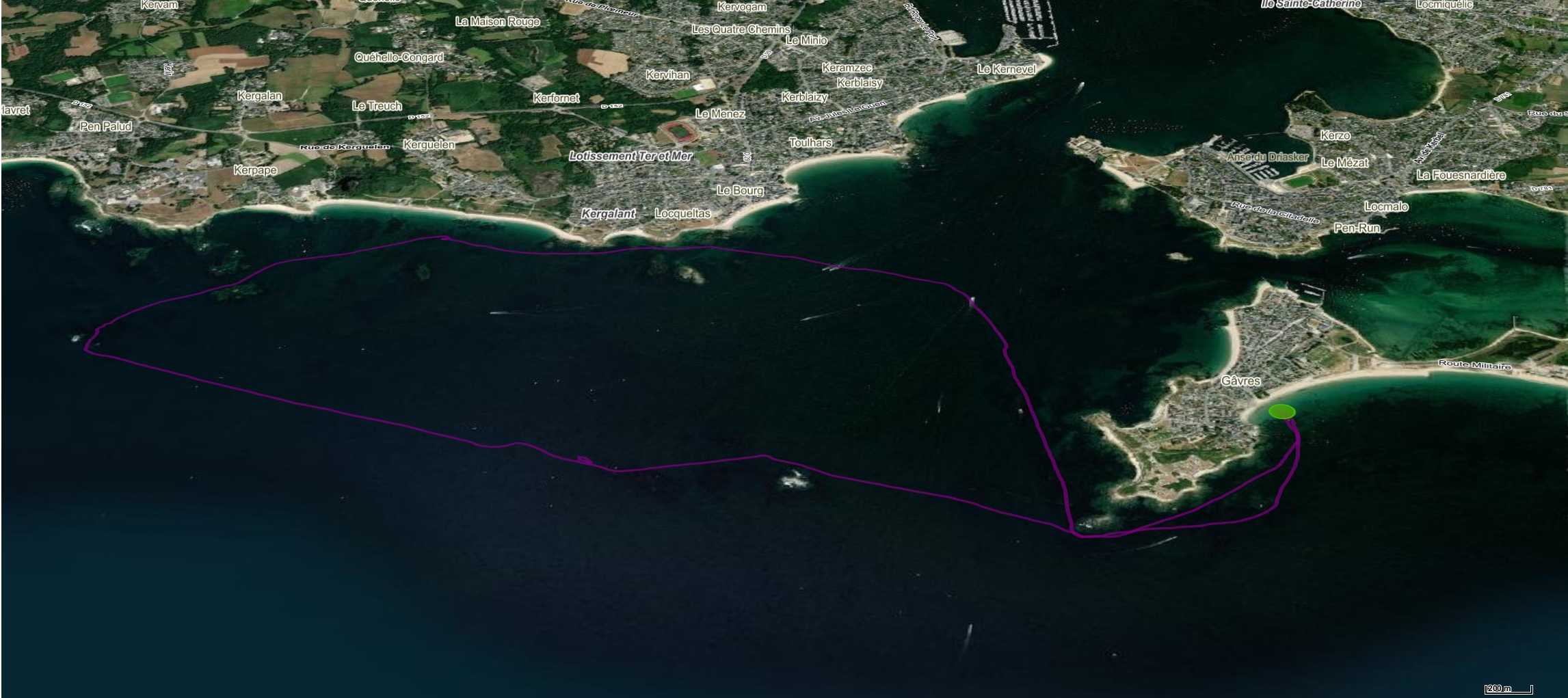 Le matin une navigation à l'est de Gâvres et rentrée dans la mer de Gâvres pour finir la boucle; l'après-midi, une navigation à l'Ouest jusqu'à Kerpape et retour.