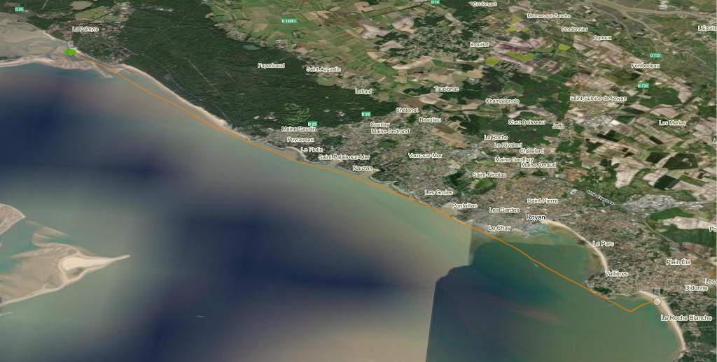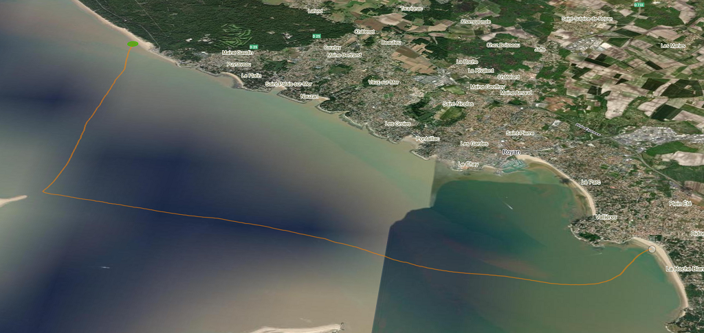 La course du Dimanche, même distance à 200 mètres près (17,4km) mais cette fois départ de Saint Palais en direction du phare de Cordouan pour virer une bouée à 6km et retour sur Saint Georges.